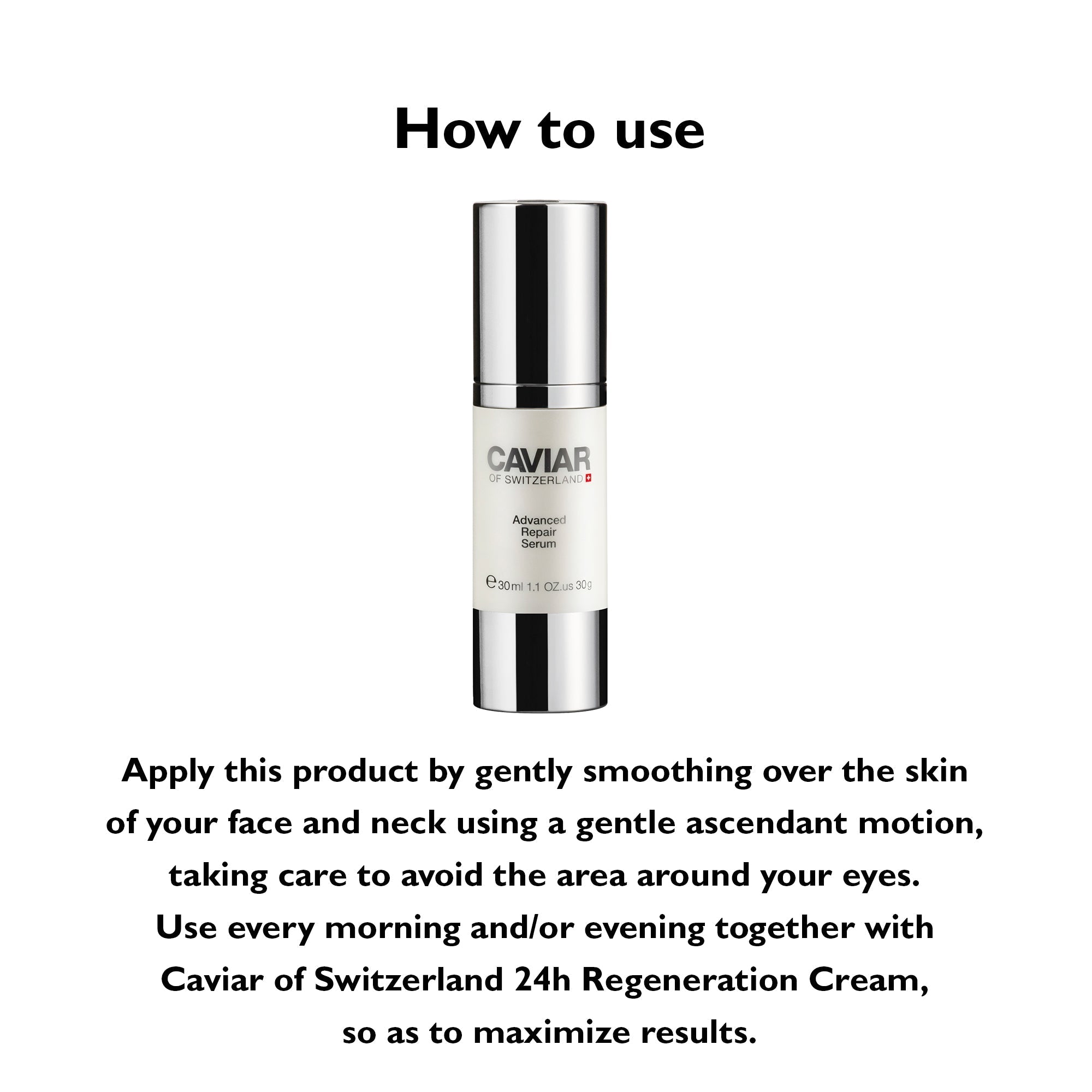 How to apply - Apply this product by gently smoothing over the skin of your face and neck using a gentle ascendant motion, taking care to avoid the area around your eyes. Use every morning and/or evening together with Caviar of Switzerland 24h Regeneration Cream, so as to maximize results.